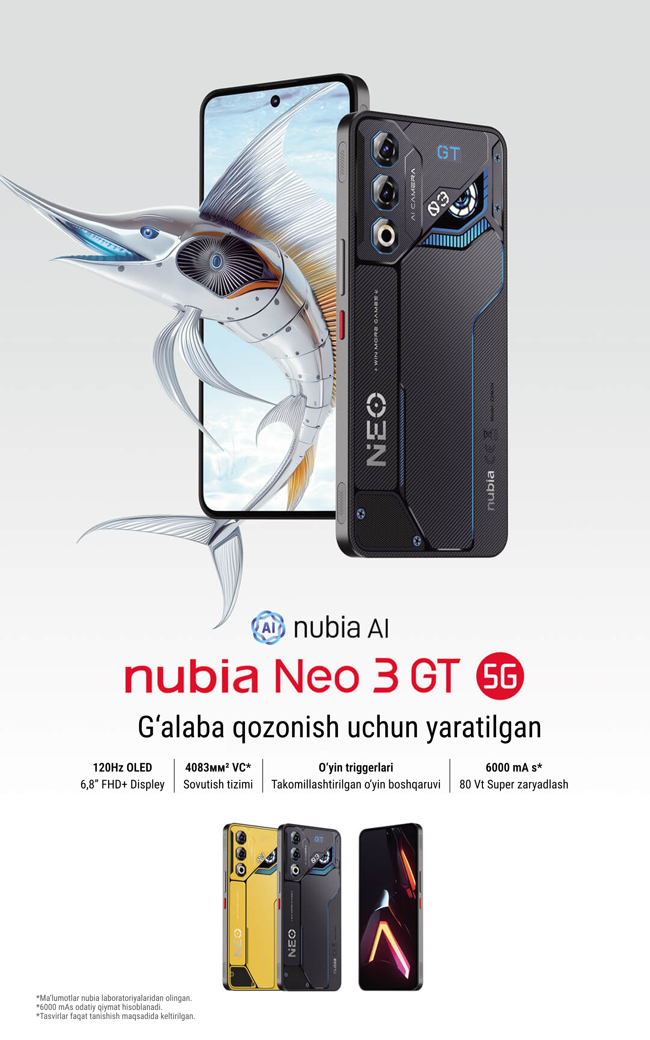 mnubia Neo 3 GT 5G har doim yangi sinovlarga tayyor bo‘lgan kibernetik jangchiga o‘xshaydi.